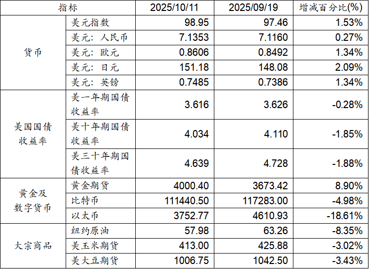 9月19日至10月11日,美元指數(shù)上漲1.53%,美元兌人民幣匯率上漲0.27%。美國一年期、十年期及三十年期國債收益率均呈現(xiàn)下跌態(tài)勢(shì)。黃金期貨價(jià)格上漲8.90%。比特幣下跌4.98%。以太幣下跌18.61%。大宗商品中紐約原油、大豆期貨及玉米期貨價(jià)格均呈現(xiàn)下跌態(tài)勢(shì)。