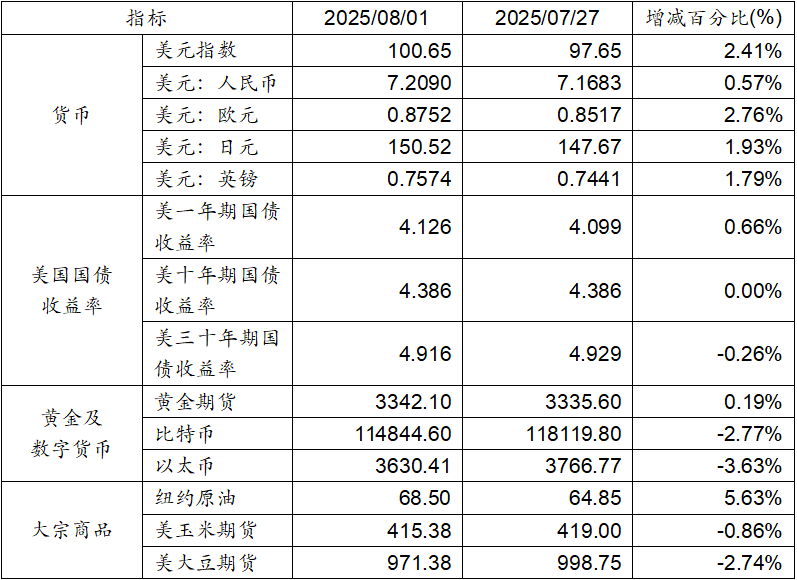 7月27日至8月1日,美元指數上漲2.41%,美元兌人民幣匯率上漲0.57%。美國一年期國債收益率上漲,十年期國債收益率持平,而三十年期國債收益率則呈現下跌態勢。黃金期貨價格上漲0.19%。比特幣下跌2.77%。以太幣下跌3.63%。大宗商品中紐約原油價格上漲,玉米期貨及大豆期貨價格則呈現下跌態勢。