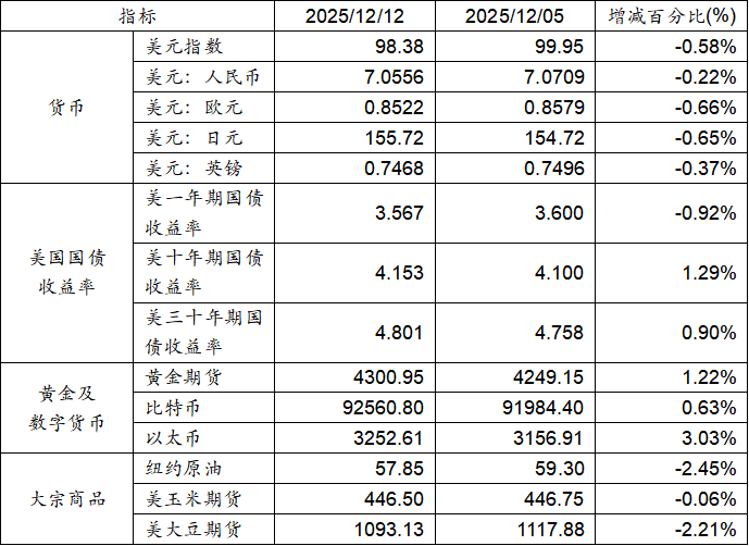 12月05日至12月12日,美元指數下跌0.58%,美元兌人民幣匯率下跌0.22%。美國一年期國債收益率下跌,而十年期及三十年期國債收益率呈現上漲態勢。黃金期貨價格上漲1.22%。比特幣上漲0.63%。以太幣上漲3.03%。大宗商品中紐約原油、玉米期貨及大豆期貨價格均呈現下跌態勢。