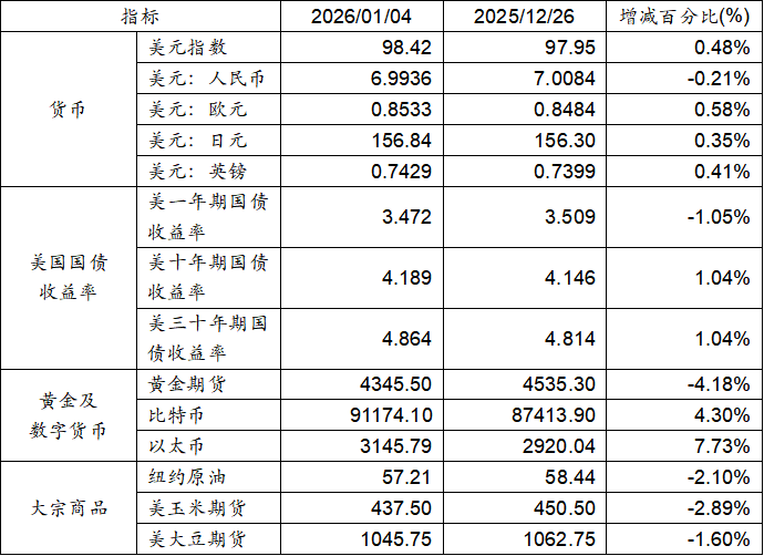 2025年12月26日至2026年1月4日,美元指數(shù)上漲0.48%,美元兌人民幣匯率下跌0.21%。美國(guó)一年期國(guó)債收益率下跌,而十年期及三十年期國(guó)債收益率則實(shí)現(xiàn)上漲。黃金期貨價(jià)格下跌4.18%。比特幣上漲4.30%。以太上漲7.73%。大宗商品中紐約原油、玉米期貨及大豆期貨價(jià)格均呈現(xiàn)下跌態(tài)勢(shì)。