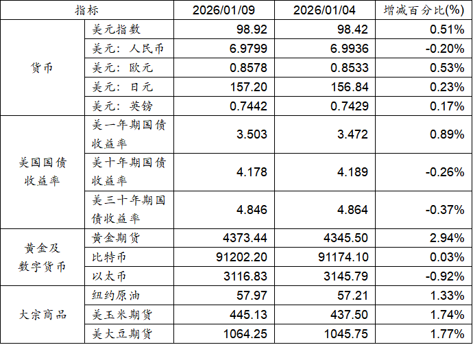 1月4日至1月9日,美元指數(shù)上漲0.51%,美元兌人民幣匯率下跌0.20%。美國(guó)一年期國(guó)債收益率上漲,而十年期及三十年期國(guó)債收益率則實(shí)現(xiàn)下跌。黃金期貨價(jià)格上漲2.94%。比特幣上漲0.03%。以太下跌0.92%。大宗商品中紐約原油、玉米期貨及大豆期貨價(jià)格均呈現(xiàn)上漲態(tài)勢(shì)。